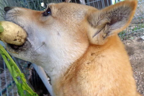 私が持っている間引き大根が待ちきれず 飛びついてくわえるユズです(笑) リキに続き初物の大根をいただくユズは 豪快にかぶりつく。 上手に前···