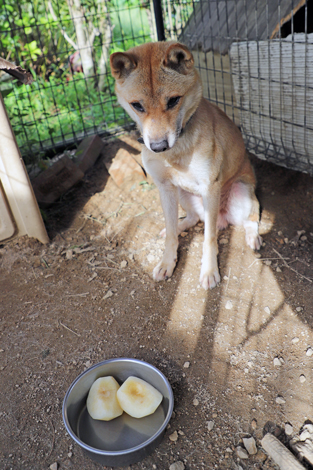 美味しい二十世紀梨を目の前に行儀よく待つリキ。 ユズとは違います(笑) ちょっと味見・・・ そしてなぜか梨を外に出しちゃうリキ。 土がつい···